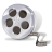 Icon Description: Round movie reel with the tape spinning or unwinding out the back.
